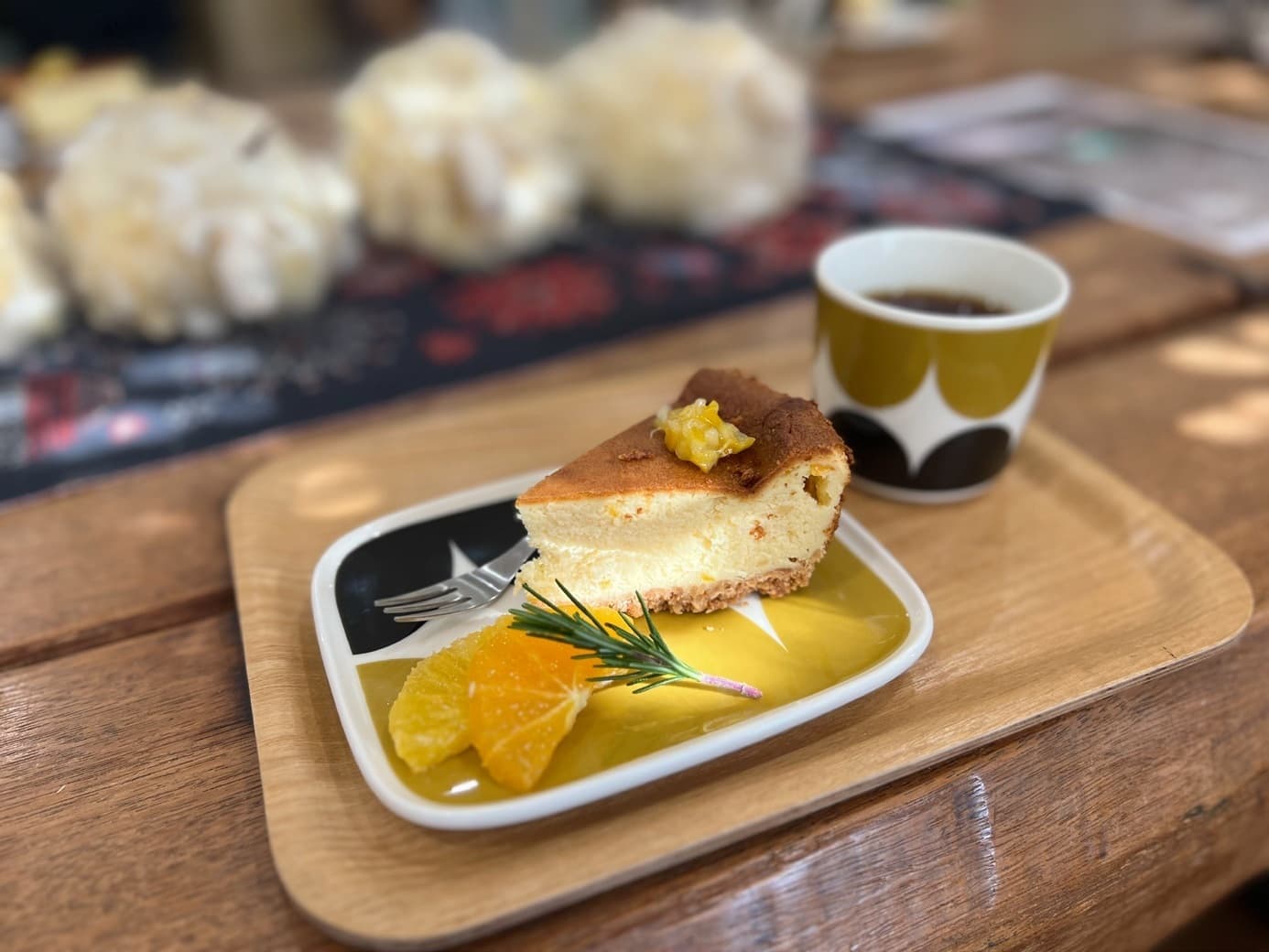 ぶどう棚の下で季節の果物を使ったケーキとお茶や、コーヒー、紅茶、ぶどうスカッシュなどをお出しします。